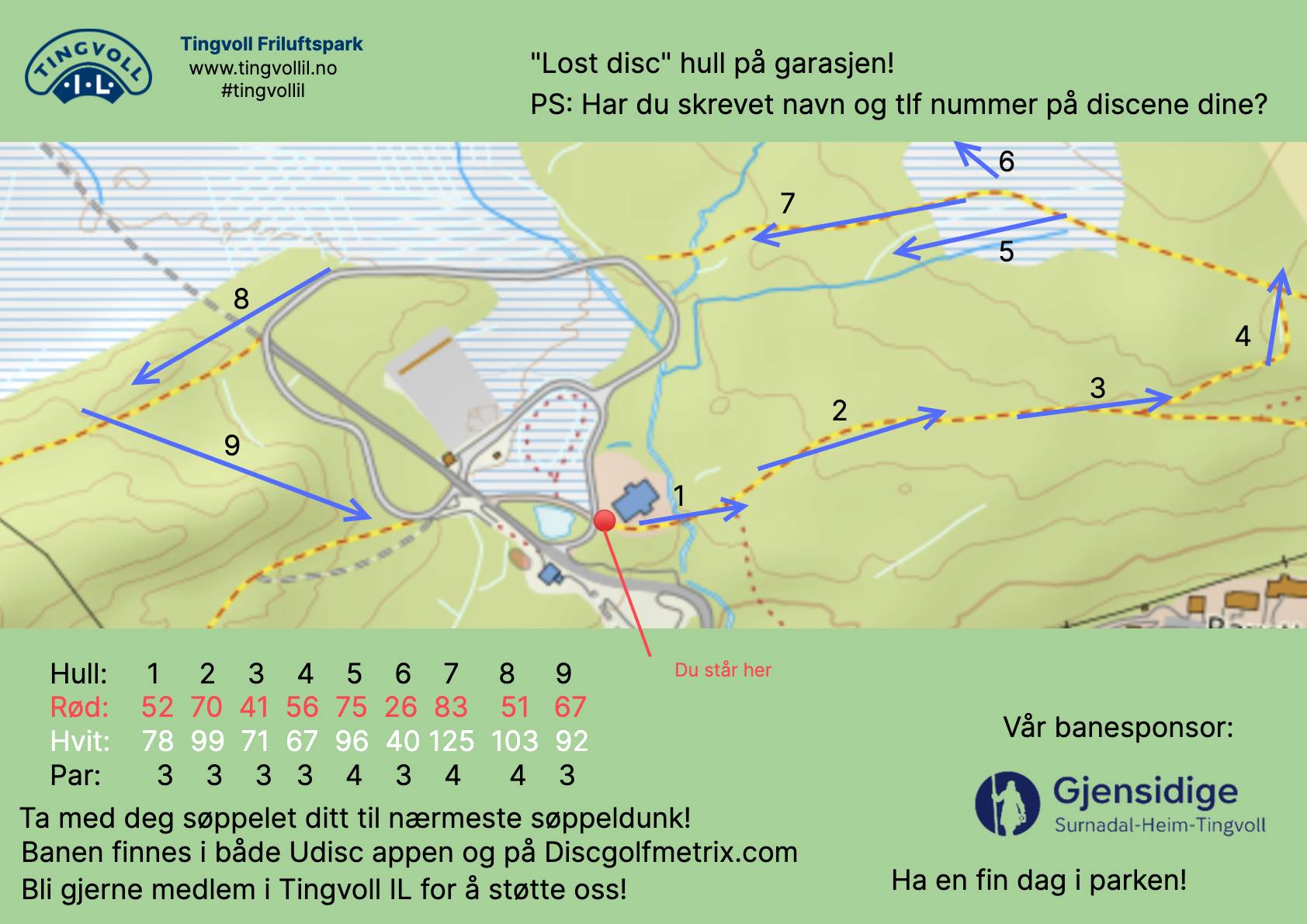 Banen er gratis å spille, men vi tar gjerne imot bidrag via Vipps for å utvikle banen. Vipps nr: 826 792, Tingvoll Friluftspark. Merk gjerne "Discgolf"