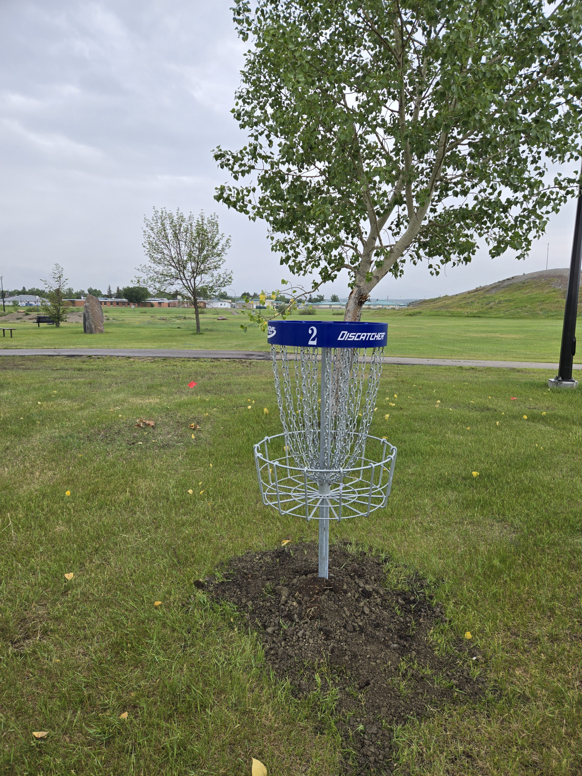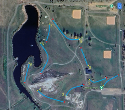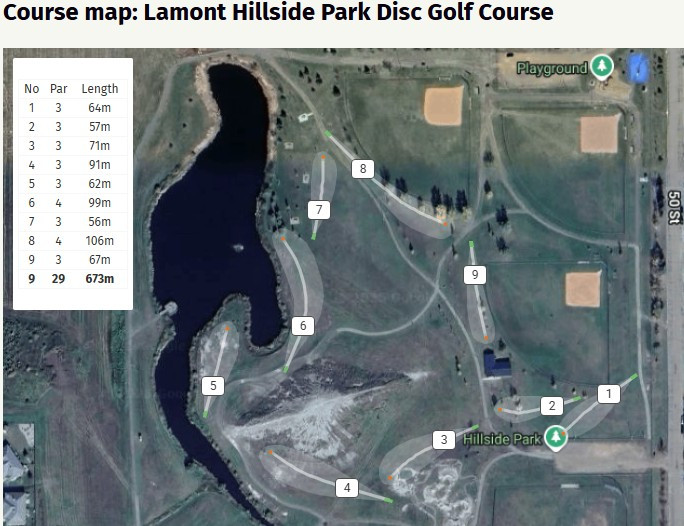 A fun 9-hole course in Hillside Park, a variety of fairway shapes and shot possibilities, with Innova DISCatcher Pro 28 baskets and grass tees. Water hazards on baskets 5 & 6. The course is located at 5532-50 Street, Lamont, AB, in Hillside Park.