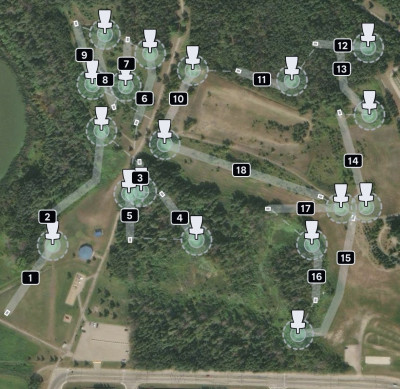 There are 9 holes with concrete tee pads and signage and 9 holes that were new in 2025 without. The locals consider there to be multiple layouts and many different holes to start at. Until the rest of the signage is put up, this is the best map to show all 18 holes.