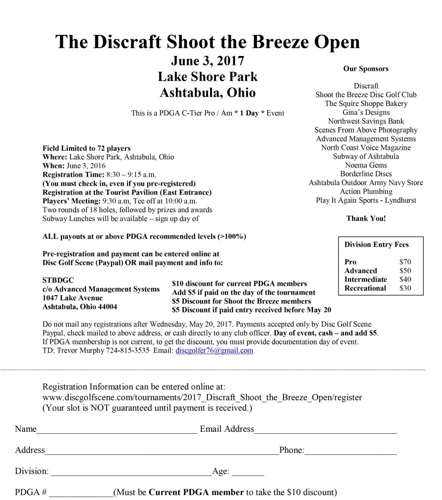 Do not mail any registrations after Wednesday, May 25, 2016. Payments accepted only by Disc Golf Scene Paypal, check mailed to above address, or cash directly to any club officer. Day of event, cash – and add $5.