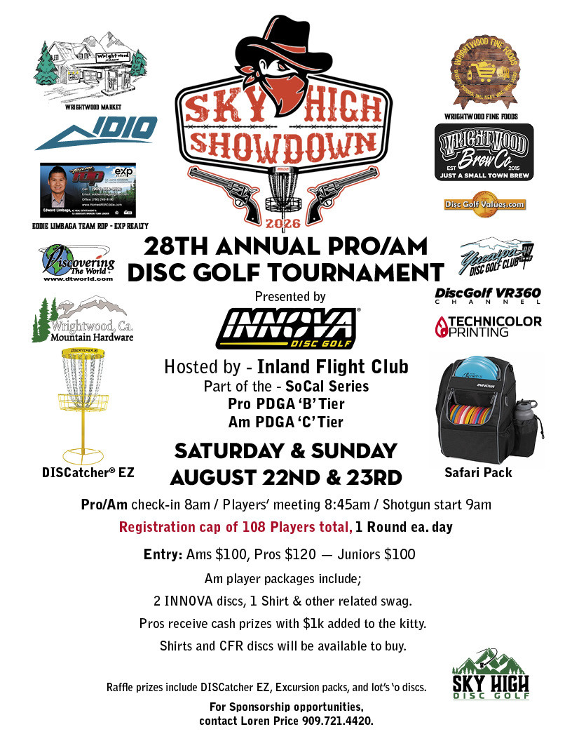 The 2026 Sky High Showdown Presented by INNOVA Champion Discs will be a Pro ‘B’ tier and Am ‘C’ tier tournament, one weekend, Saturday, August 22nd and Sunday, August 23rd, 2026, Pro/Am event, with one round of 27-holes each day. Pros will compete for cash, minus pass-through fees and an additional $1,000 cash. Ams will compete for trophies and gift certificates from Discovering the World.
