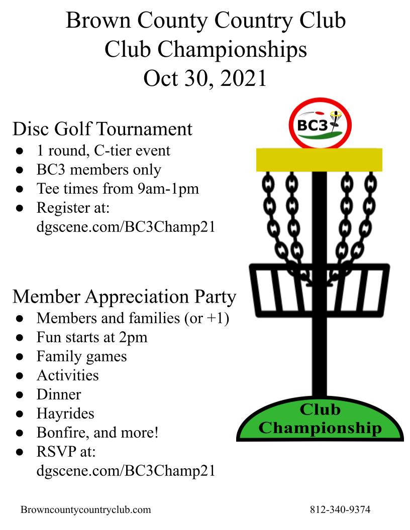 The BC3 Club Championship is coming to Brown County Country Club again! This two part event is a show of appreciation to our members for their generous support. We'll play a PDGA-sanctioned round of BC3 Disc Golf to crown this year's Club Champs. We've got an after party planned for the whole family including games, activities, hayrides, dinner, and a bonfire.