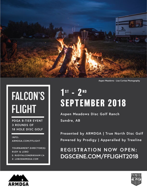True North Disc Golf and Prodigy present Falcon's Flight. Ron 'Rudy' Falconer welcomes you to join us for the final event of the ADGTour at Aspen Meadows Disc Golf Park in Sundre, Alberta.