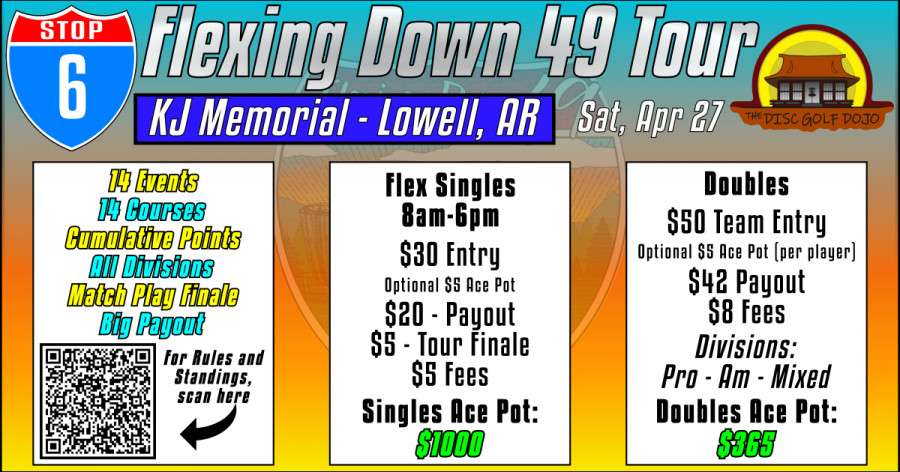 The Flexing Down 49 Tour is a unique disc golf series of events where players compete for a chance to play for huge payouts at the Finale event in October! Each Tour Stop features a PDGA sanctioned Flex Start event where players earn tour points based on the round rating they earn during play. Players who play in 8 or more tour stops will receive invites to the Match Play Finale! Regular season standings will determine seeding for the Finale's unique Match Play Bracket. Last year we paid out almost $3000 at the Finale! Don't miss your chance to play in this one of a kind event!