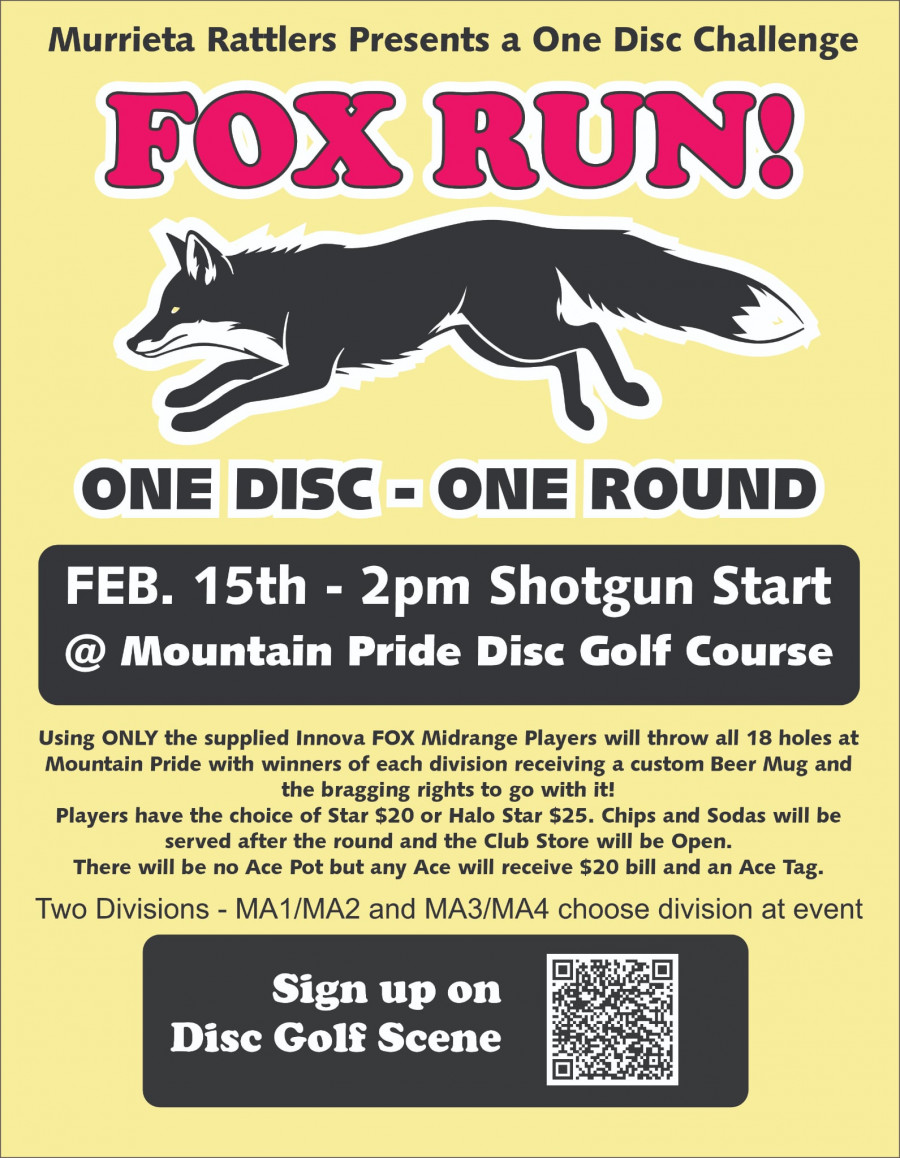 Murrieta Rattlers presents a One Disc Challenge. FOX RUN using ONLY the supplied Innova FOX Midrange, players will throw all 18 holes at Mountain Pride with winners receiving a custom Beer Mug and bragging rights to go with it! Players have a choice of Star $20 or Halo Star $25. Chips and sodas will be served after the round, and the Club Store will be Open.