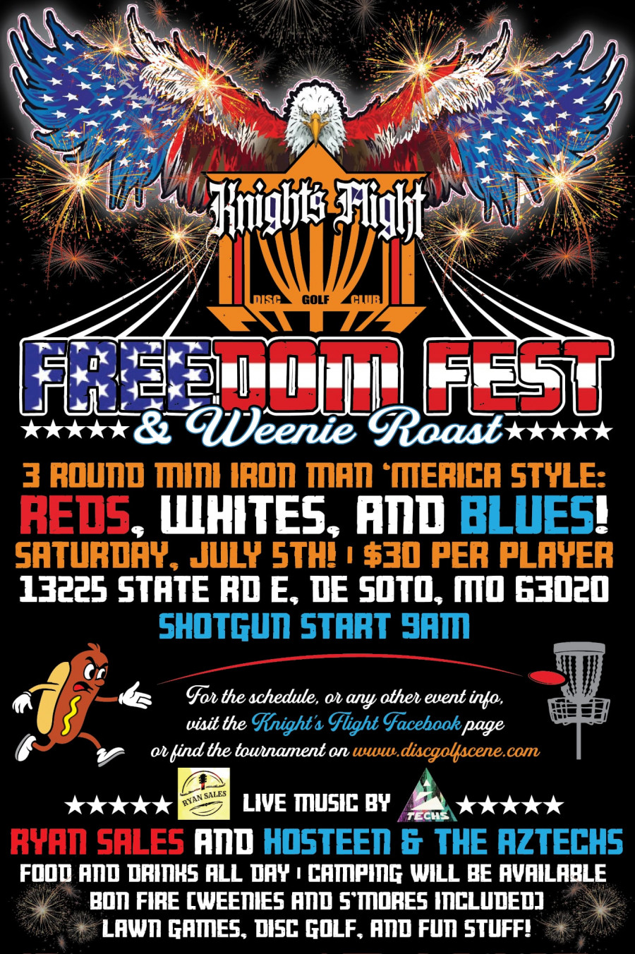 There will be food and drinks all day, camping night of event(also available night before), bon fire (weenies and s’mores included), live music, freedom, lawn games, liberty, fun stuff, uhh other things…. Lots of good stuff!! We may even blow some stuff up!!! America F**k Yeah!!! As always you are welcome sign up in person after 3pm weekdays and after 10am weekends. day of registration will be allowed but pre registration is preferred. Player’s pack for Ams includes club stamped disc by Gateway, Sublimated event towel & other goodies!! Ams paid in Smokin Aces vouchers, Pro’s paid Cold American Cash!