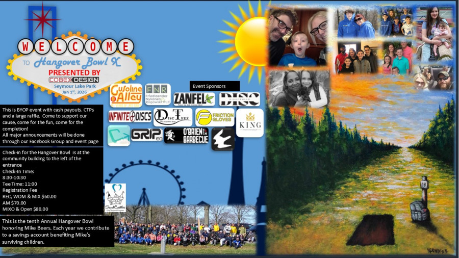 I never expected any of this, so many years of loss mixed with the joy of coming together. In 2015, when Mike passed, I had just gotten into the disc golf scene. I have been playing since 92, but casually with a group of friends. I hooked up with Gone Discin, met Josh Cook (for the second time) and we were peas in a pod. He jumped in with both feet to help Mikes family. Between Josh Cook, Josh Admunson, and Steve Zelecki we had quite the foursome and had plans...... Each year that passed by we grew; we lost Steve in 2018 and Josh C in 2021, our friends and family stepped up each year to lend us a hand and it has been truly appreciated! I have powered through each of the last 4 years since Josh passed, (and I know Josh A has done the same since Steve passed) but mentally it has not been the same. I need to recharge and take a step back from hosting this event. Hangover Bowl 10 will be the final one, when and if things settle in and I find myself again I may start it up again. THANK YOU for your years of support and looking forward to seeing those that can make on Jan 1st 2026!