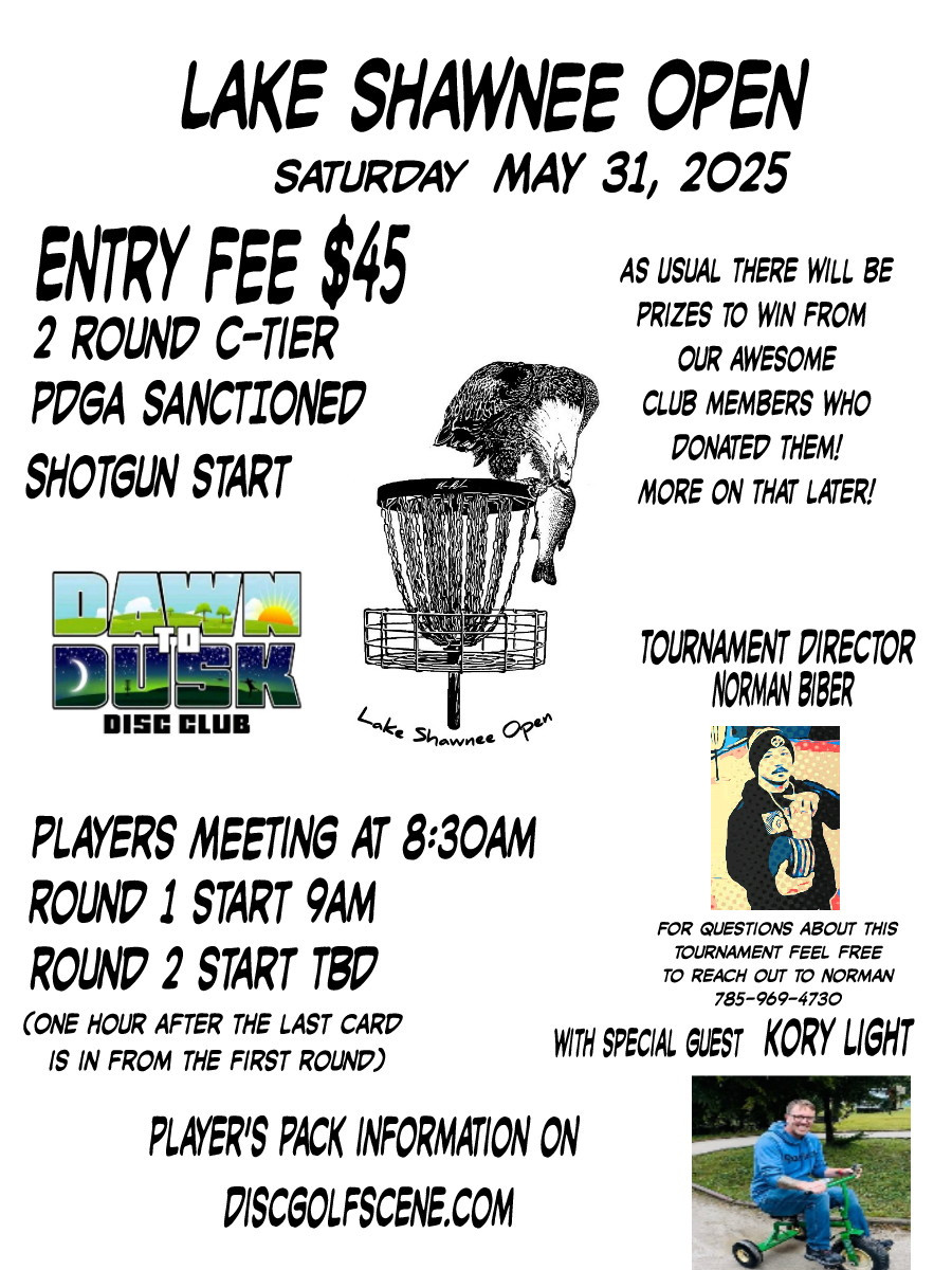 The time has come for the annual Lake Shawnee Open. This makes year number 7. It is a PDGA-sanctioned C-tier tournament. On May 31st, we will play two rounds at our beautiful lake disc golf courses, Lake Shawnee North (OG) and Lake Shawnee South (ALT). First round starts at 9 am, and the second round starts 1 hour after the last card is in from the first round. Players meeting is at 8:30 am!
