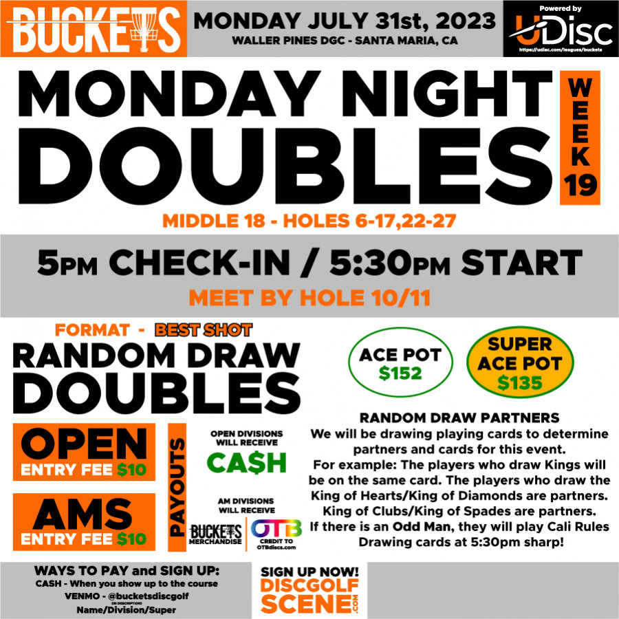 We’ll play the MIDDLE 18. (Holes 6-17/22-27) This will be a Shotgun start at 5:30pm sharp. Check-in will be at 5pm by Holes 10 and 11. We will be drawing play cards at 5:30 sharp. ACE POT is at $152! The Super Ace Pot is at $135. (The Super Ace Pot will be a separate Ace Pot, $5 to enter and is optional.) $10 for OPEN and AMs. Sign-ups will be available on DiscGolfScene if you want to sign-up early or you can show up day of with Cash or Venmo - @bucketsdiscgolf.