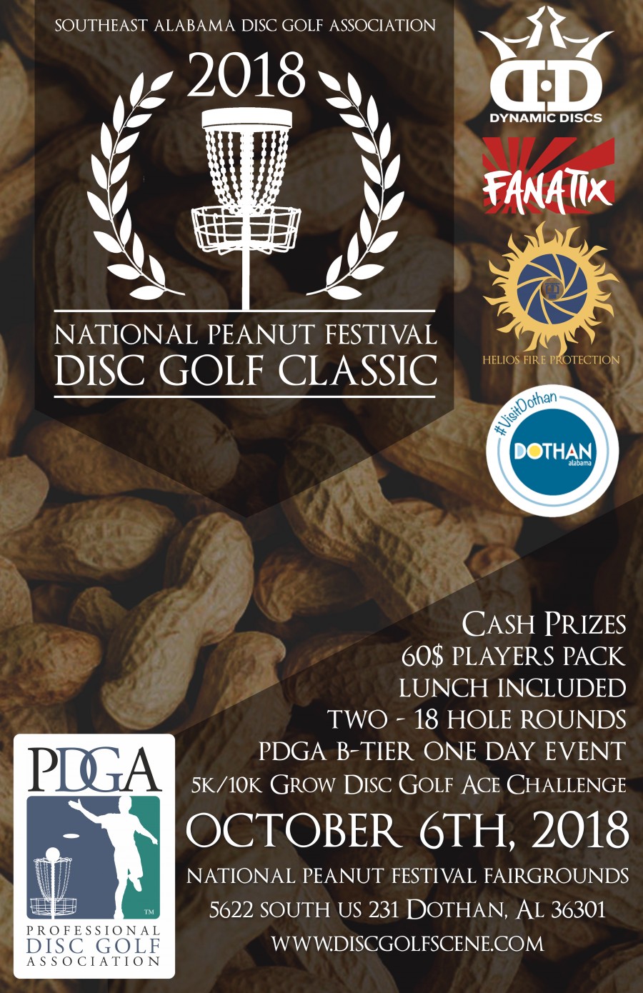 Dothan's first ever PDGA B-Tier is a one day, 2 round tourney on a temporary 18 hole course throughout the National Peanut Festival Fairgrounds. Lunch provided. Players Pack includes custom dry-fit t-shirt, custom stamped disc, disc of your choice, and Flight Towel. CTP's, Long Drive Competition, and free entry to the $5k/$10k Grow Disc Golf Ace Challenge!