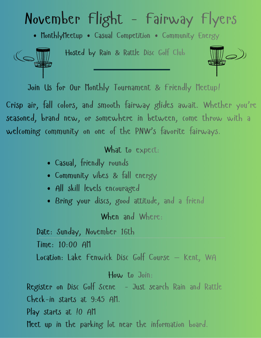 A monthly meetup focused on community, connection, and casual play. Whether you’re a seasoned player or completely new to the game, this is the perfect way to enjoy disc golf in a relaxed and supportive environment.