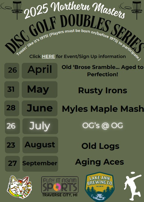 Northern Masters Doubles fourth event of the year. We are not a series, you don't have to be a PDGA member, you do not have to pre-pay or pre-register. You have to be born in 1975 or earlier to play in our events, and we welcome you to pre-register. We are a random draw doubles and your entry fee includes ctps and the ace pool. We conclude with a nice afterglow and lunch on site. Thanks to Tilley's Party Store, Lake Ann Brewery and Play it Again Sports, Traverse City. Come and hitch your wagon to a lucky star