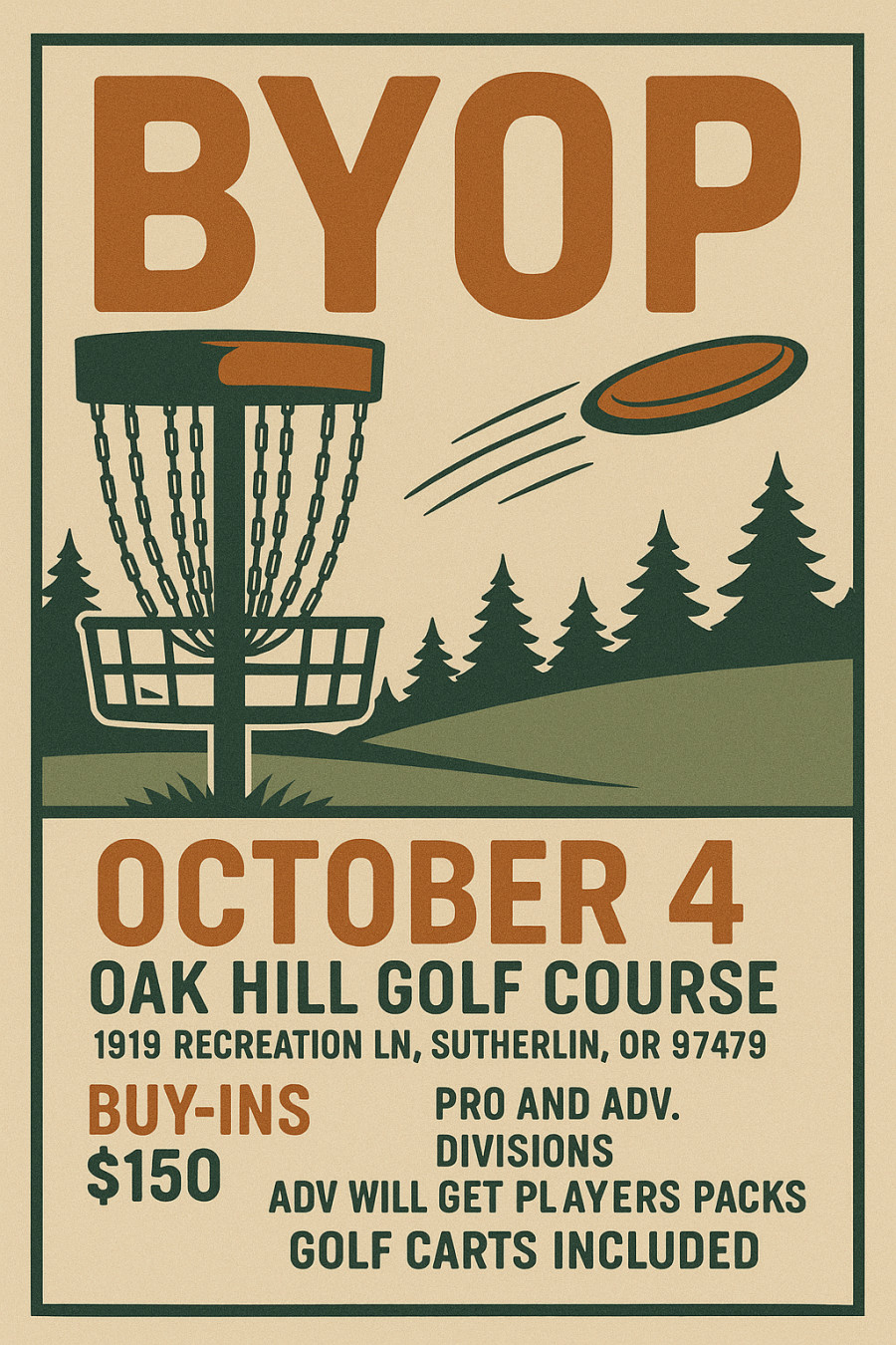 Get ready for an unforgettable day of disc golf at the beautiful Oak Hills Golf Course in Sutherlin, Oregon! On October 4th, we’re hosting a 1-day doubles tournament featuring two rounds of 21 holes — all played on a pristine ball golf course with golf carts included.