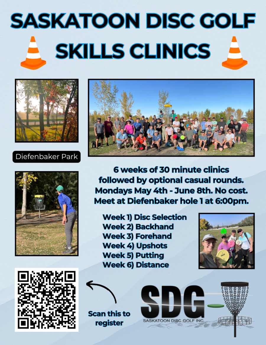 Open to all skill levels. 6 weeks of short 30-45 minutes clinics followed by optional casual rounds. Mondays May 4th-June 8th. No cost, meet at Diefenbaker hole 1 at 6:00pm.