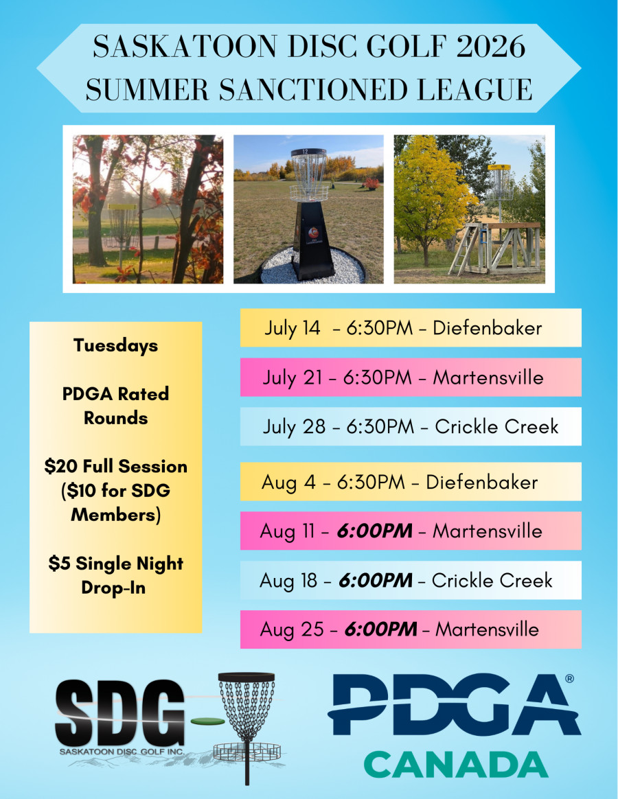 7 rounds of sanctioned play at Diefenbaker, Martensville and Crickle Creek every Tuesday from July 14th to August 25th.