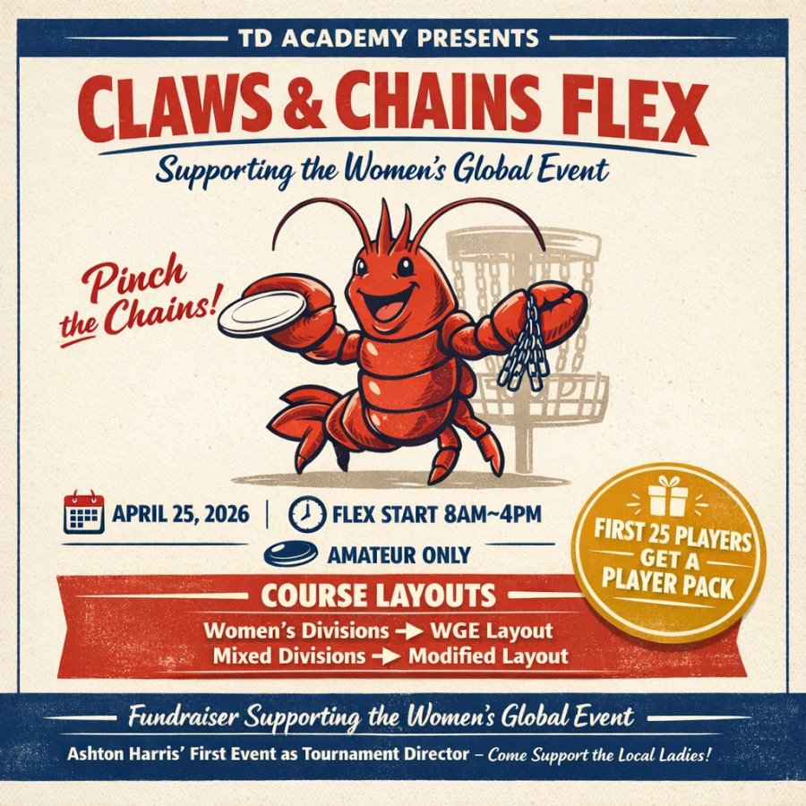 Join us for a fun flex start fundraiser tournament supporting our local Women's Global Event (WGE) on May 16th! This event is open to all amateur players and is designed to help grow the support of women's disc golf while welcoming everyone out for a great day of slingin discs!