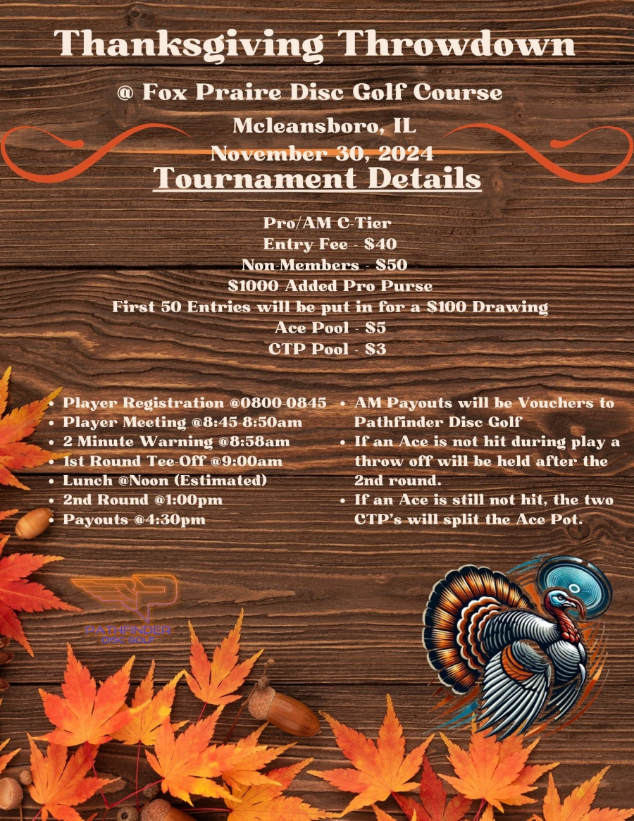 Will update the layouts per division as we get closer. Earn a chance to win $100 be one of the first 50 registered. All am payouts will be merchandise though Pathfinder disc golf.