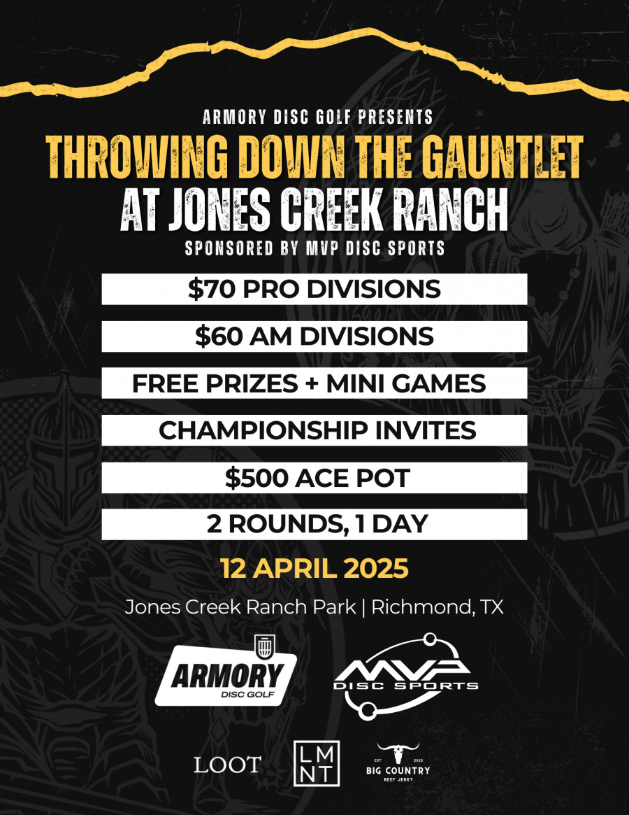 WELCOME to the Throwing Down the Gauntlet at Jones Creek Ranch, an Armory Disc Golf Gold Tier Event Sponsored by MVP Disc Sports!