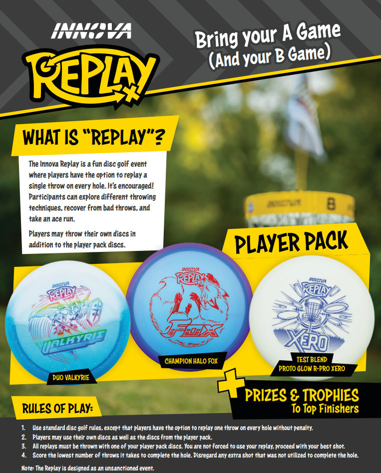 The Innova Replay is a fun and unique disc golf event where players have the option to replay one throw on every hole — and it's encouraged!