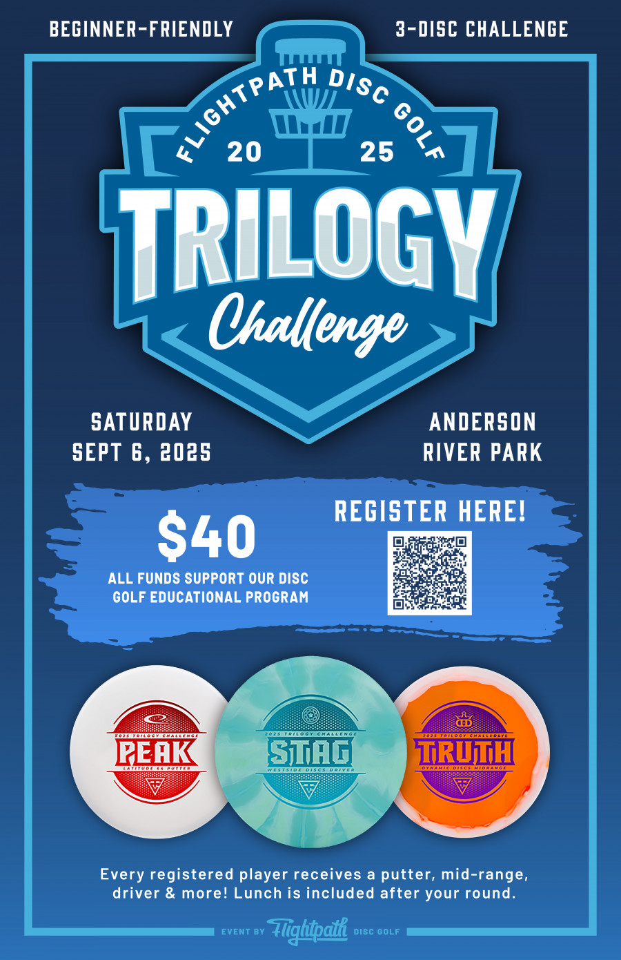 The Trilogy Challenge is BACK for Flightpath's 3rd annual fundraiser tournament to support our disc golf educational program. This 3 disc challenge features putter, mid-range and driver in a never before seen plastic combination.