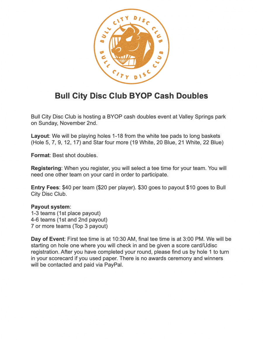 Bull City Disc Club is hosting a BYOP cash doubles event at Valley Springs park on Sunday, November 2nd.