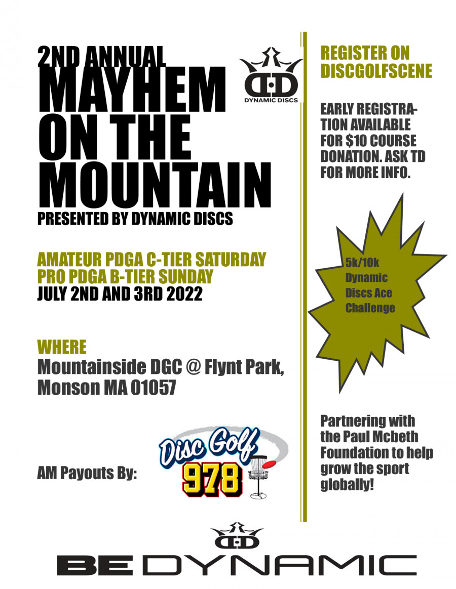 Mayhem on the Mountain welcomes all y'all back to the Mountain!! We're honored to bring this event to your doorstep for its second year. A huge shout out and thank you to Dynamic Discs and the amazing community of individuals and companies who offered their support of this event. Another big thank you to the Monson Park and Rec as well as the local disc golf community for making this course special!