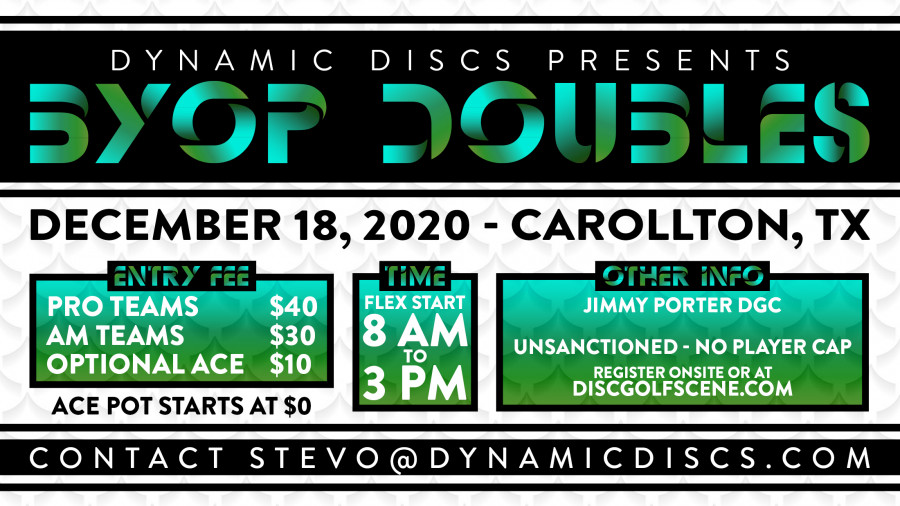 Any person may compete in a Dynamic Discs BYOP (Bring-Your-Own-Partner) Doubles event. Competitors DO NOT need to be current PDGA members to register. Participants are eligible to compete in any division for which they qualify based on age, rating, gender and class (professional or amateur based on PDGA guidelines). Dynamic Discs BYOP Doubles events do not award trophies nor do they offer a player’s package. Dynamic Discs BYOP Doubles events offer 100% Payout to all divisions. Scores and registration are uploaded to a public google document periodically throughout each Dynamic Discs BYOP (Bring-Your-Own-Partner) Doubles event so competitors and the general public alike may follow participation, scores, and final results.