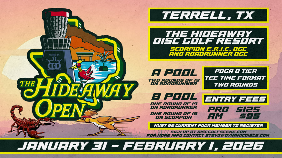 This tournament will consist of two rounds only. A Pool competitors will play the Roadrunner course for both rounds (long tees both rounds). B Pool will play the Roadrunner Course the first round (short tee pads) and the Scorpion Course the second Round. One round each day on a tee time format. Tee times will begin as early as 7:30 a.m. each day to give everyone plenty of daylight to complete their round with time to spare for travel. There's a strict player cap of 180. Registration opens Friday, December 12, 2025 @ 7:00 p.m. More info can be found on the registration page and schedule. Please email [email redacted] with any additional questions.
