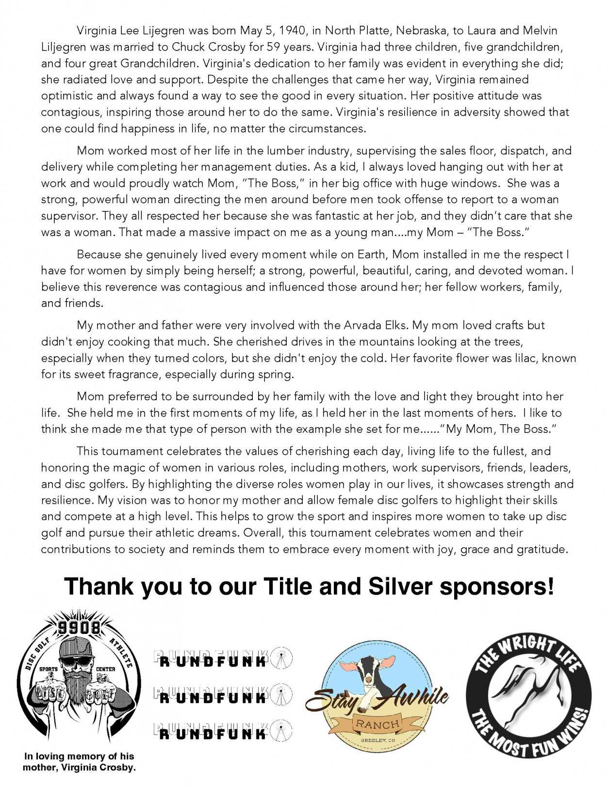 Longs Peak DGC and #9908 Disc Golf Sports Center present the 1st Annual Virginia Lee Crosby Memorial (Women only event)
