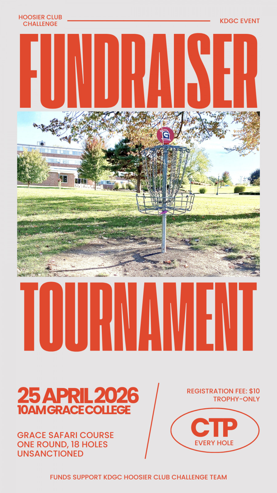 The Kosciusko Disc Golf Club (KDGC) is hosting this fundraiser tournament. Your registration fee will go directly to supporting the team's trip to Nashville, Indiana for the 2026 Hoosier Club Challenge Qualifier Tournament.
