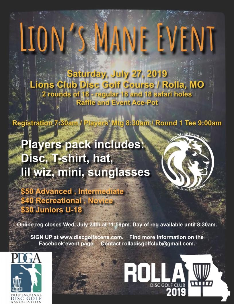 Join us in Rolla to the play Lion’s Club Disc Golf Course and an additional 18 safari holes for a 2-round tournament on July 27th!