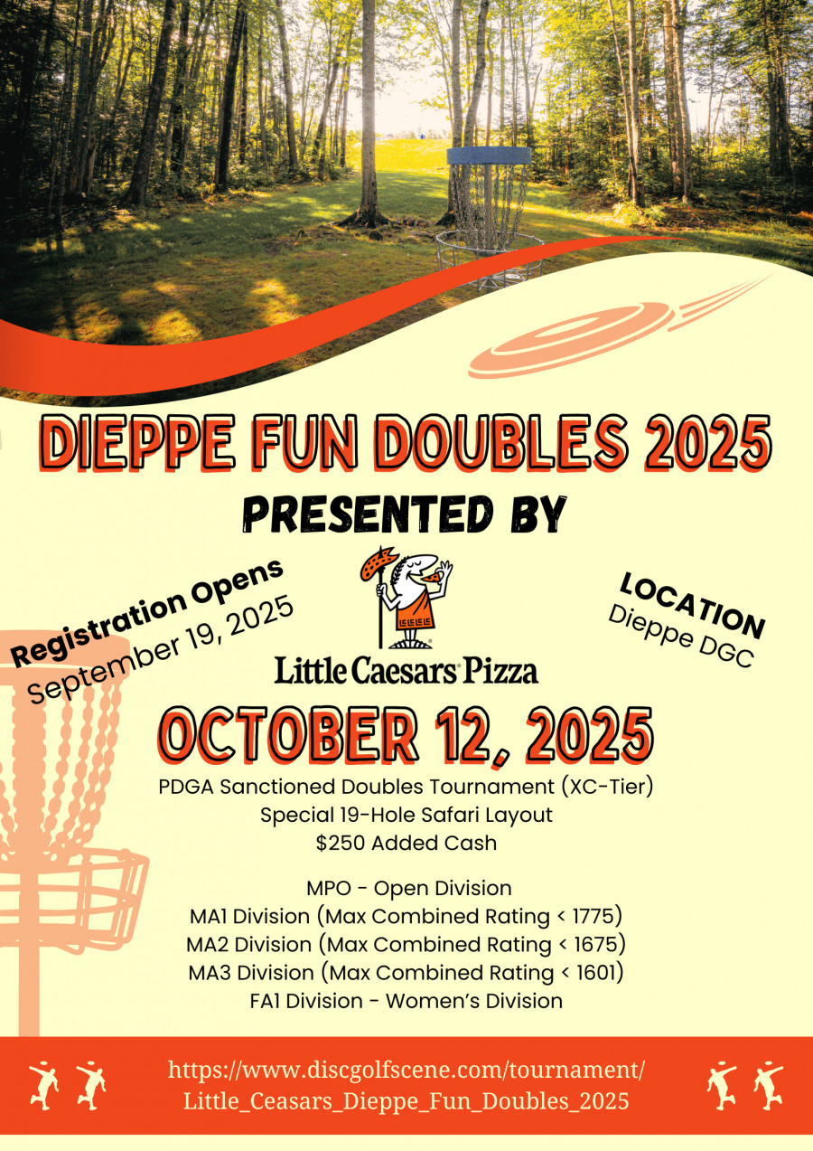 Welcome to the 2025 edition of the Little Caesars Dieppe Disc Golf Fundraiser Fun Doubles! This year's funds collected from the event will be redirected to help with more course improvements and support our next editions of the Dieppe Open.