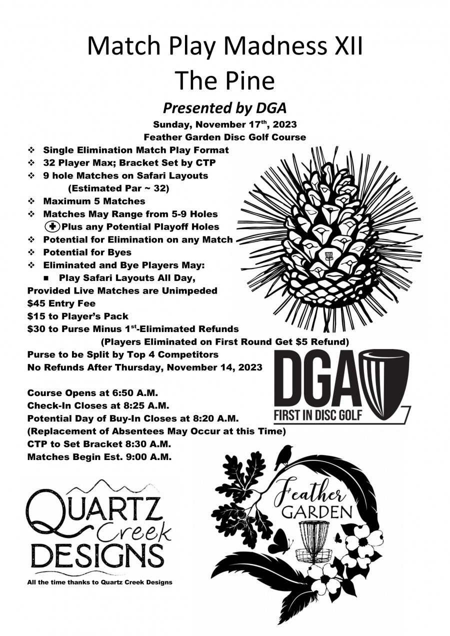 Single elimination match play; 1-day bracket tournament; 9 hole safari layout with alternating pin locations on some holes; 32 player max; top 4 competitors earn trophy and payout; 12th annual Match Play Madness; Tourney has been held at Carmichael, Pioneer, Charlie's (Skull Mountain), and is now in 4th year at Feather Garden; Make a weekend of it,pair this tourney up with Super Charlie's Winter Series; Coordinate Skull Mou tain or Feather Garden for Camping