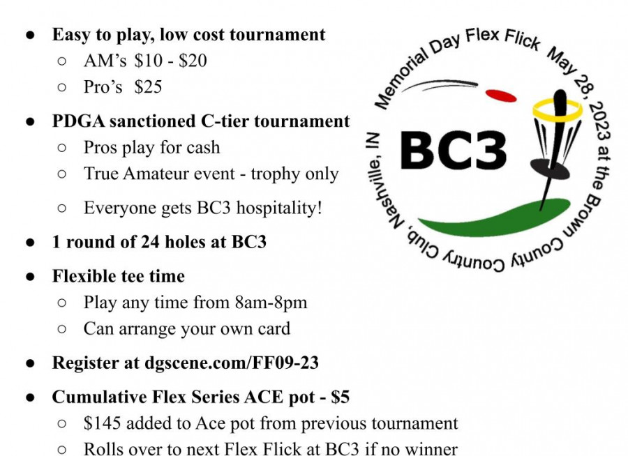 The Memorial Day Flex Flick is a 1-day, 1-round, PDGA-sanctioned, Pro and Amateur C-tier tournament at the Brown County Country Club (BC3 Disc Golf) on Sunday, May 28, 2023. This event provides a great introduction to the disc golf tournament experience for newer players, while making it easy for experienced players to get a rated round and points.