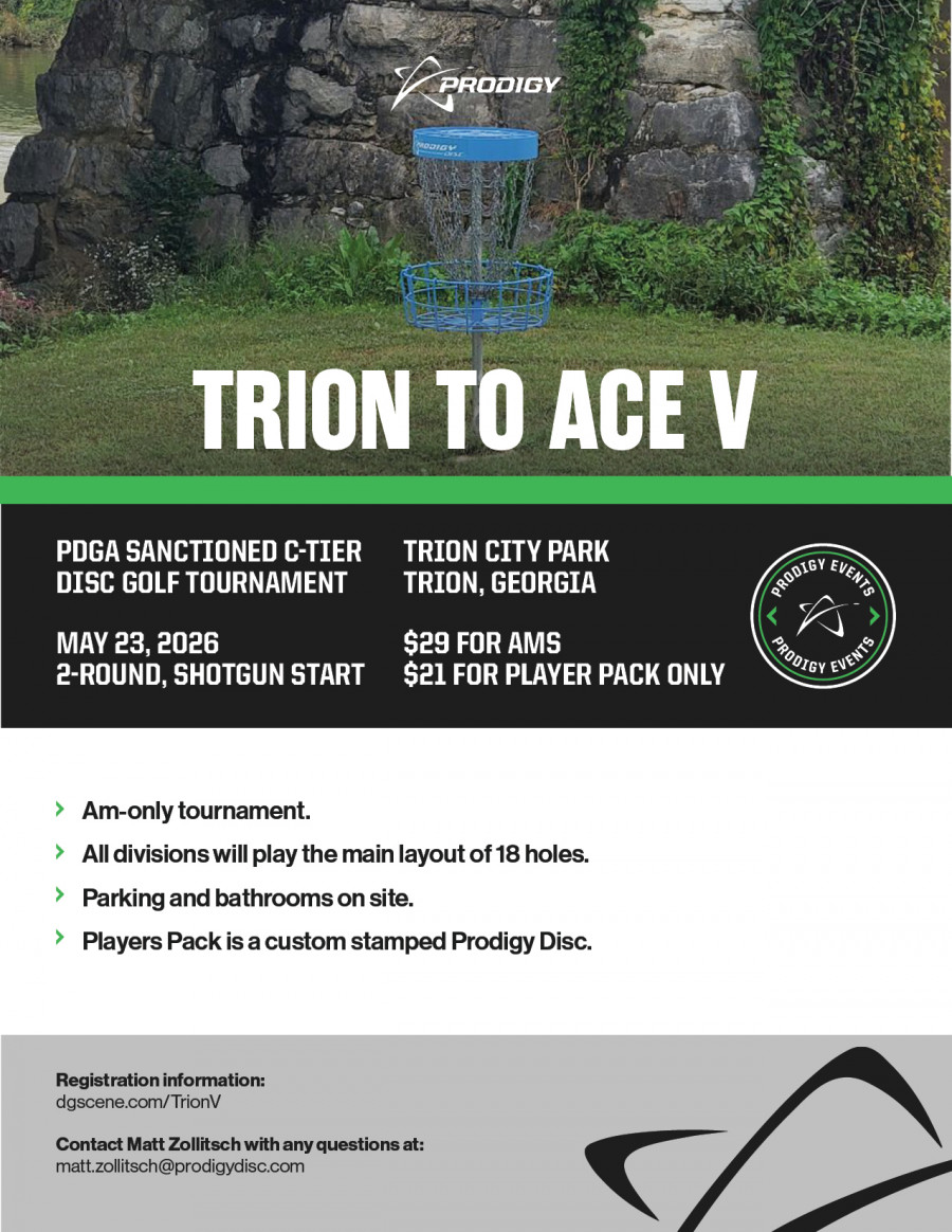 Welcome to the 4th Annual Trion to ACE @Trion City Park, GA. This event is a PDGA sanctioned C-Tier, 2 round shotgun start, AM only tournament. Awesome players pack and Trophies for 1st per division.