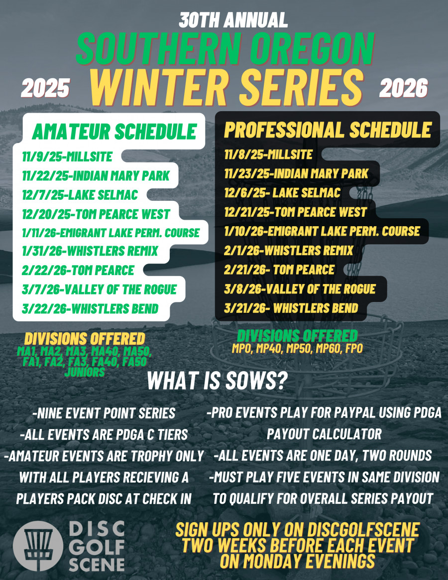 Southern Oregon Winter Series is responsible for all refunds/cancellations. We follow ALL PDGA Guidelines for Refunds. It is the players responsibility to read the PDGA refund guidelines. This includes a $10 handling fee for all drop outs even if your spot in the event is filled.