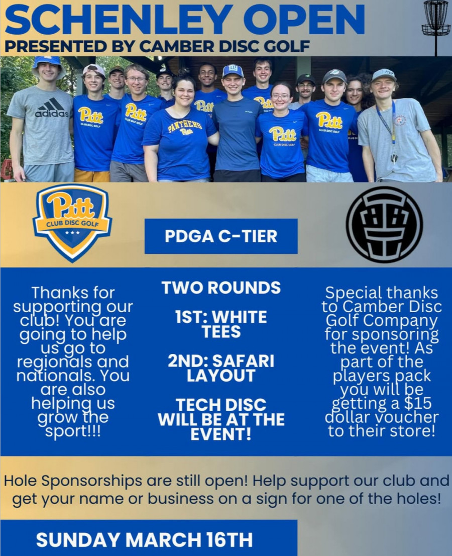 Introducing the first annual Schenley Park Open on March 16th, a C-tier, 2 round tournament sending its proceeds to help fundraise for the collegiate disc golf team at Pitt, as they travel to the Lynchburg Flamethrower Championship (at Ivy Hill & New London) in March, and the CDG National Championship in April, at Winthrop University!
