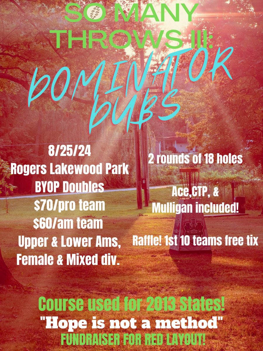 THIS IS A BYOP DOUBLES TOURNAMENT ON THE 18 hole DOMINATOR LAYOUT(the most difficult layout at Rogers).