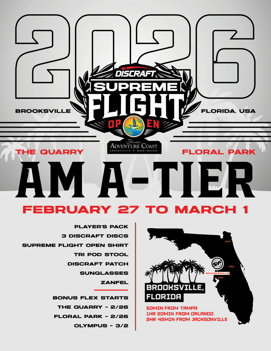 This event runs alongside the first DGPT stop of the year, Discraft Supreme Flight Open Presented by Florida's Adventure Coast, at the Olympus Disc Golf Course. Make sure to check out the action by purchasing discounted tickets through the Amateur event registration.