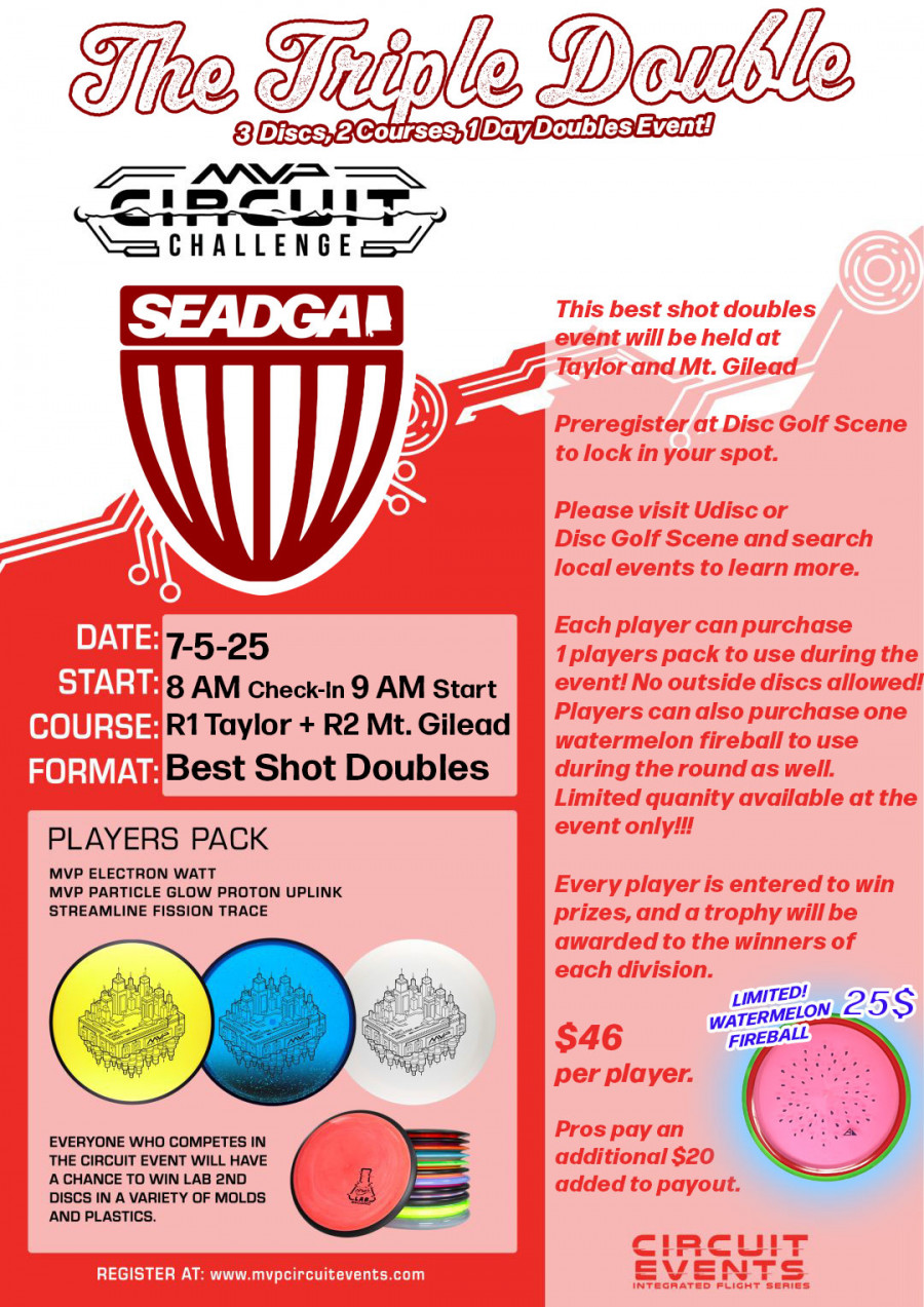 The Circuit Challenge is back! Play in a Circuit Challenge to be the first to get your hands on three discs from the MVP family of brands before their general release to the public. This will be a best-shot, using the player's pack discs only, doubles event. Both team members must be eligible for your chosen division. Pros will be playing for an additional $20 per player in the MPO division. The mixed division is trophy only. Pro payouts will be paid through PayPal.